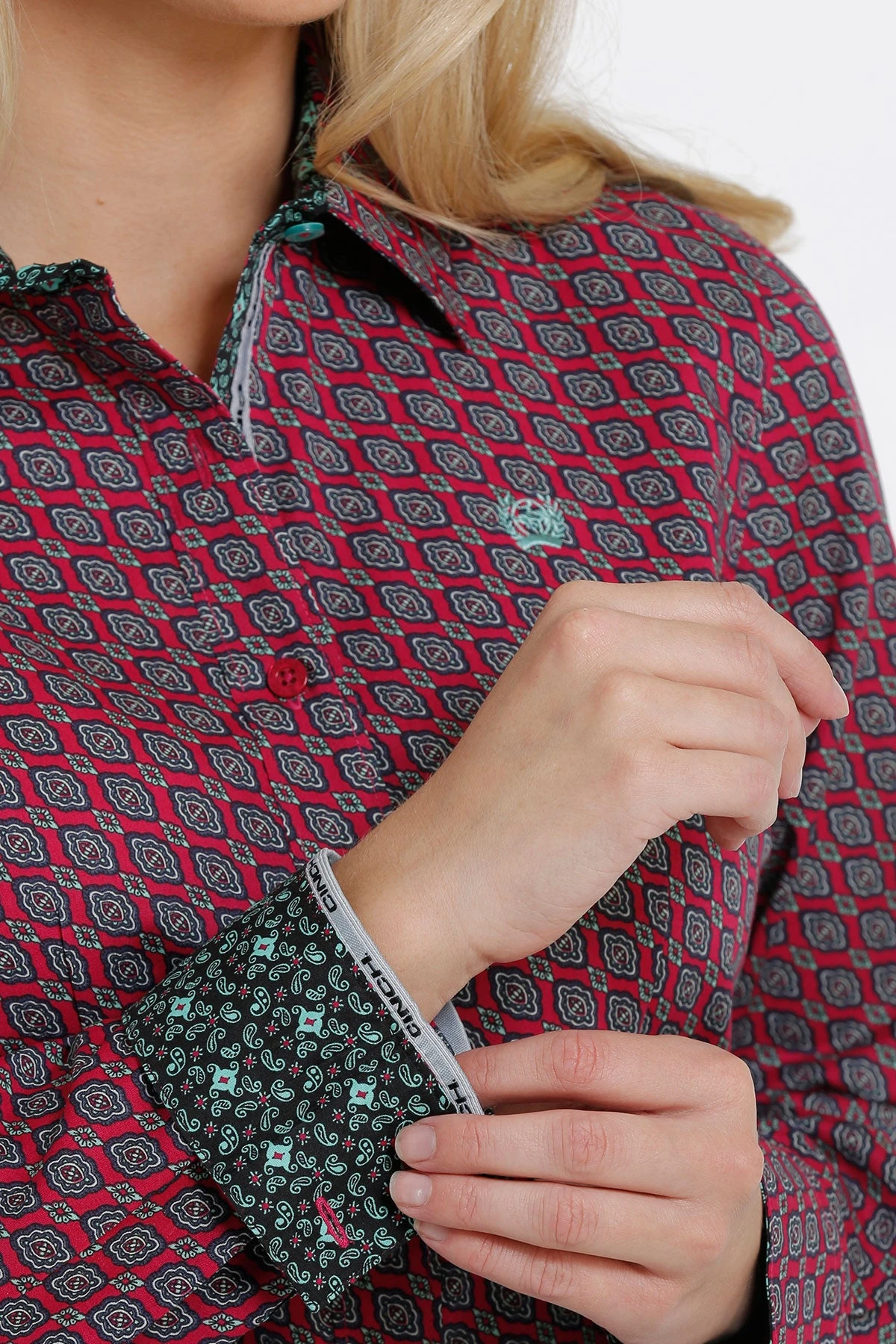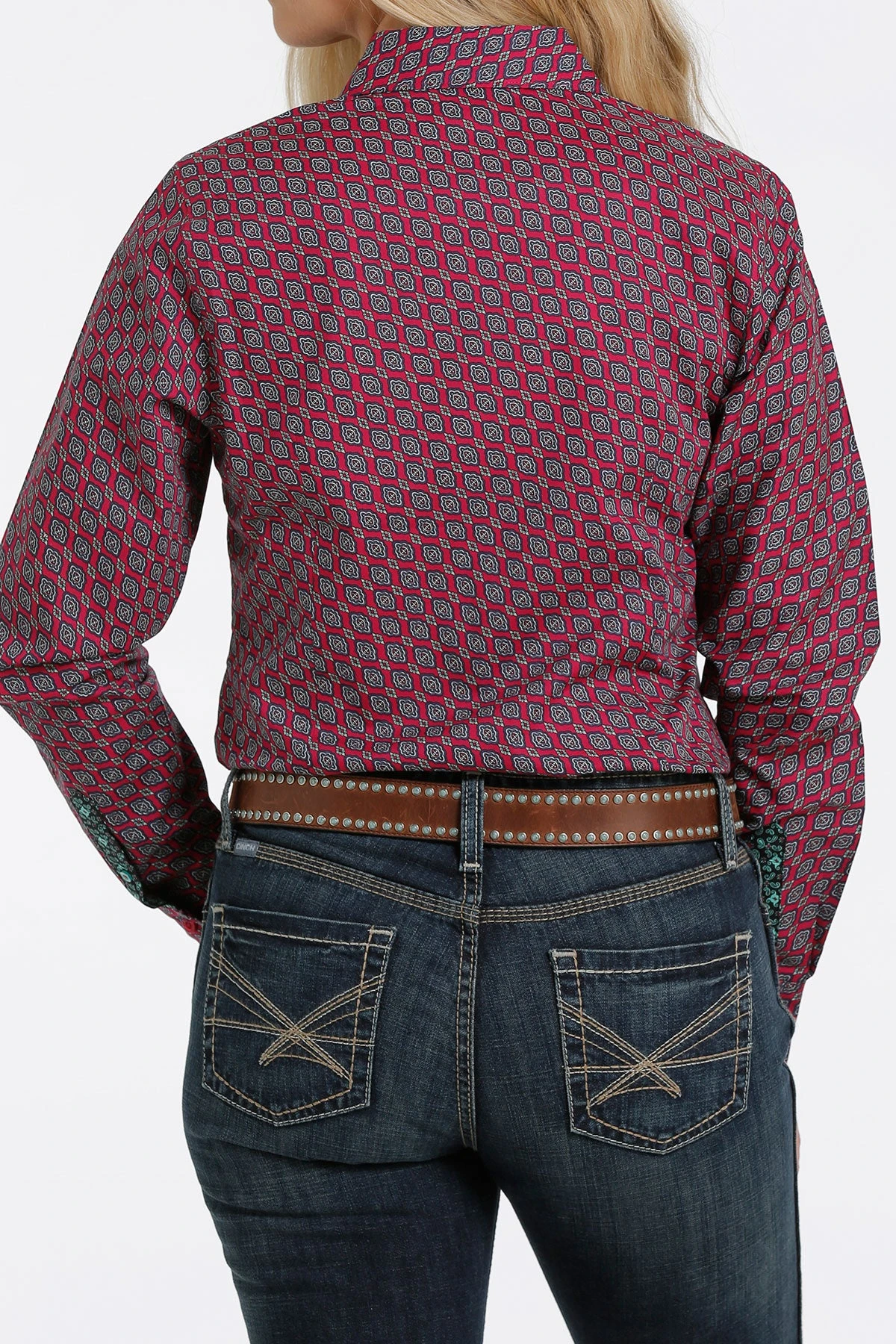 Pink, Black and White Printed Long Sleeve Button Down Shirt.