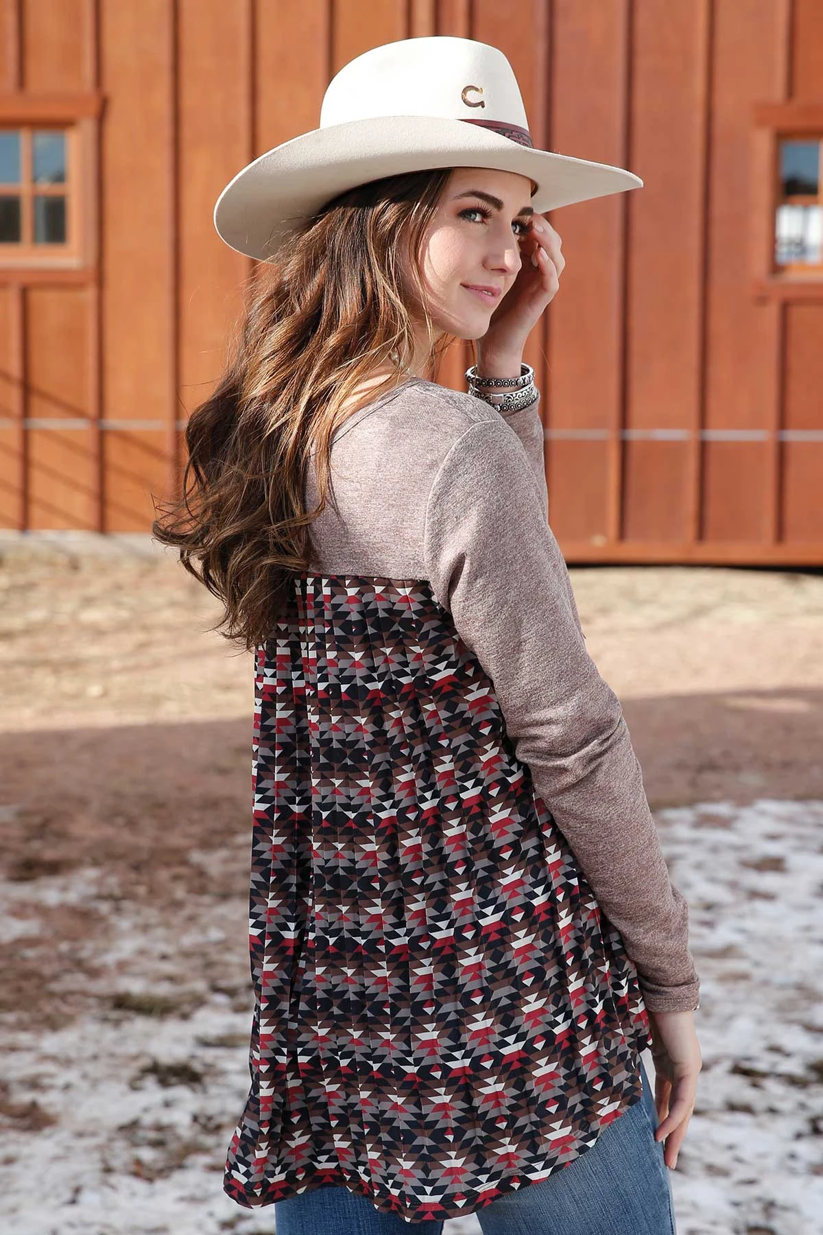 Heathered Brown Georgette Sweater with Print and Pleated Back.