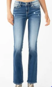 Medium Distressed Wash Bootcut Jean with Feather Dreamcatcher Pocket.