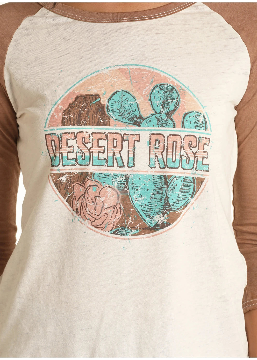 Tan, White and Turquoise Baseball T-Shirt with “Desert Rose” Graphic.