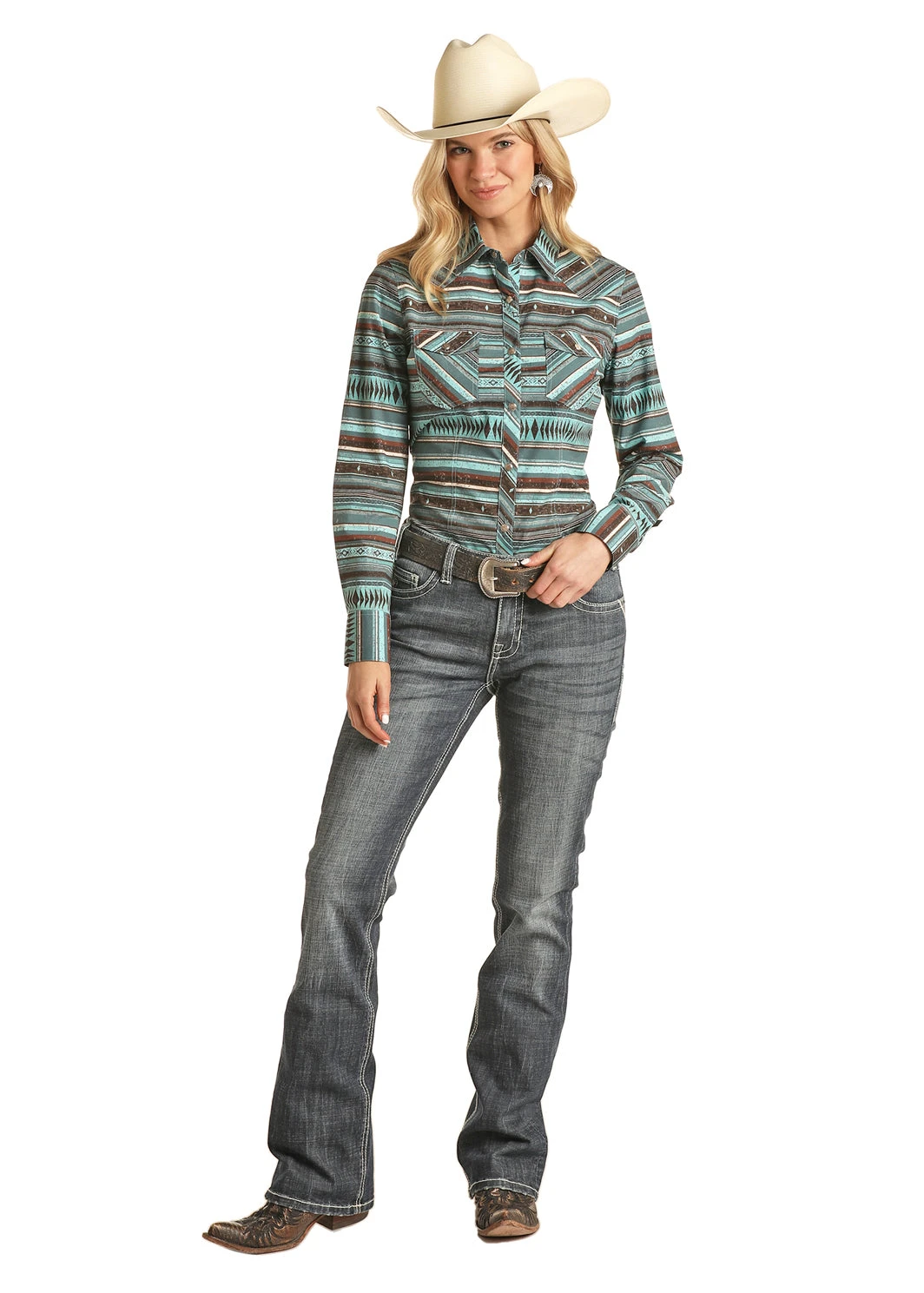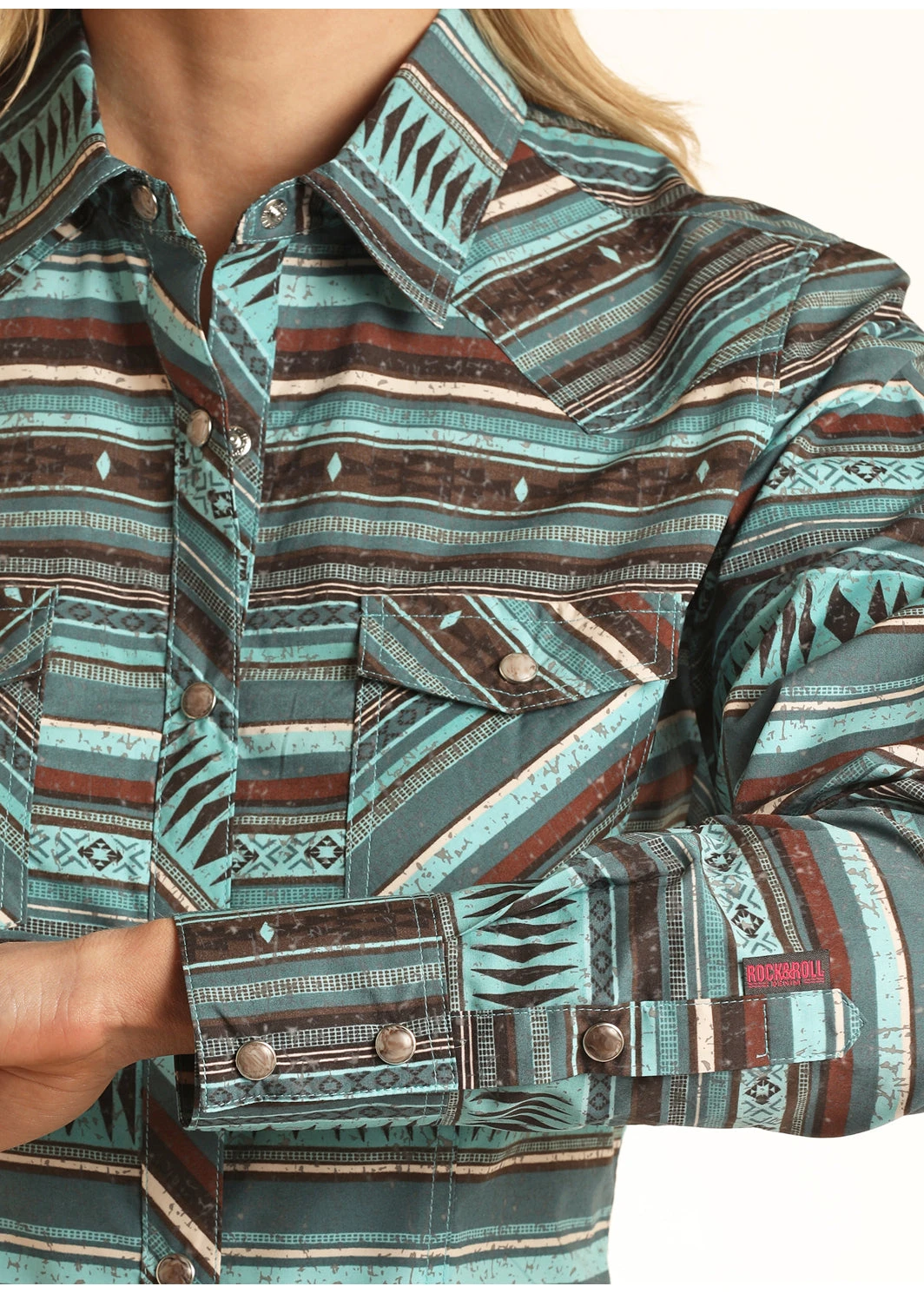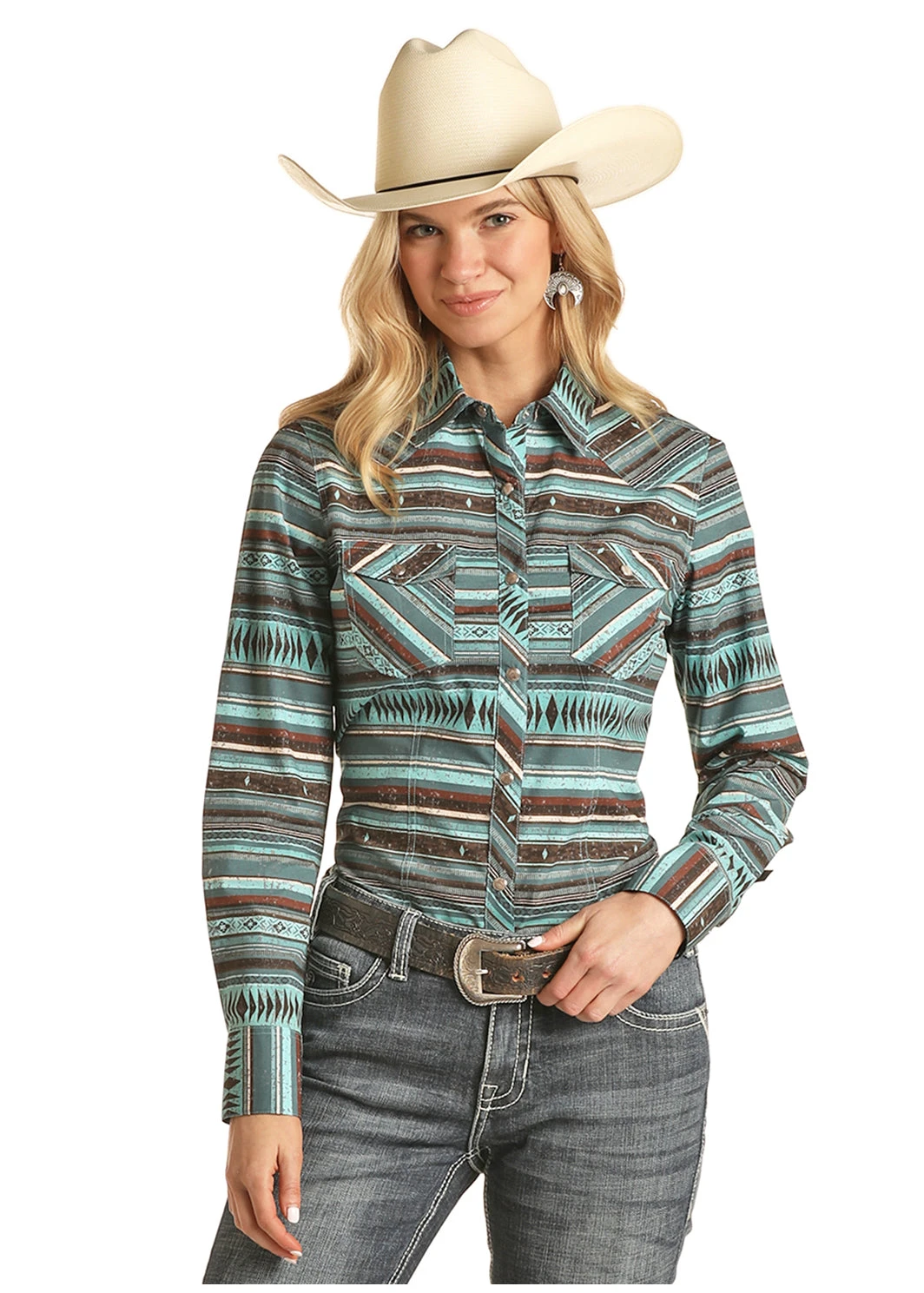 Aqua Aztec Stripe Long Sleeve Snap Front Shirt.