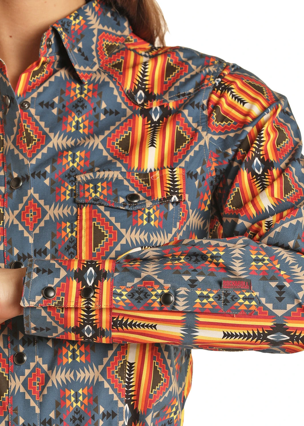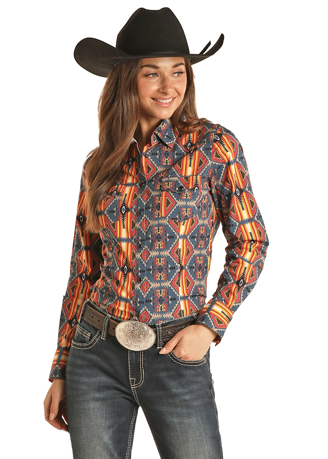 Blue and Orange Aztec Print Long Sleeve Snap Front Shirt.