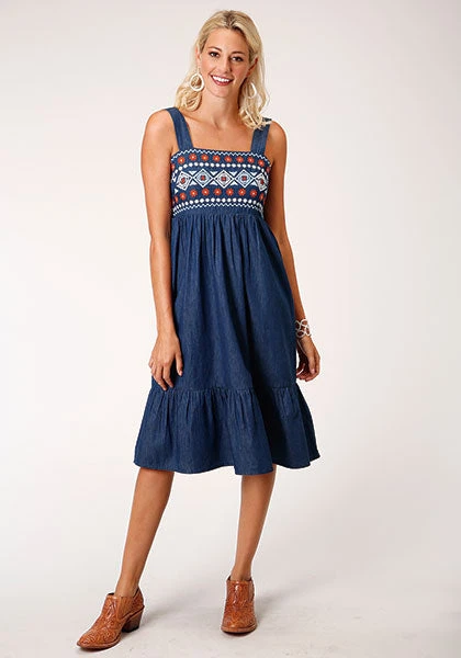 Dark Blue Denim Dress with Multi-Color Embroidery on Front Bodice.