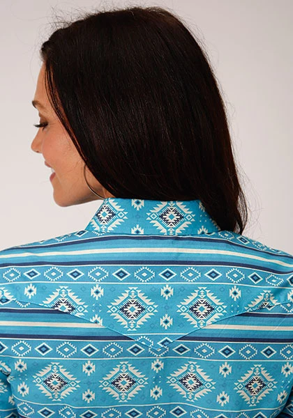 Blue Horizontal Aztec Print Long Sleeve Snap Front Shirt.