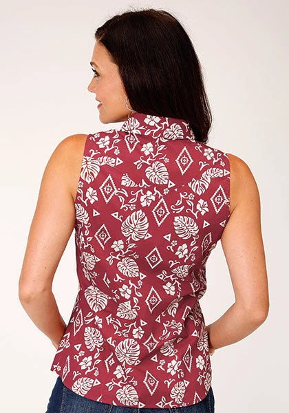 Red and White Tropical Print Sleeveless Snap Front Shirt.