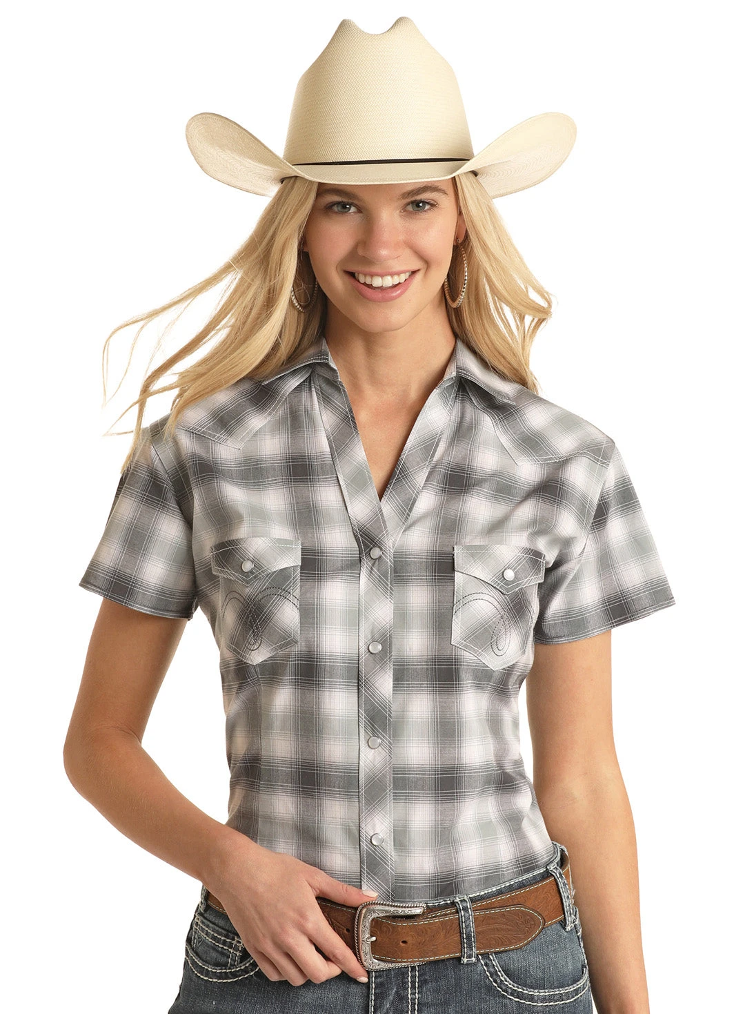 Grey and White Ombre Plaid Short Sleeve Snap Front Shirt.