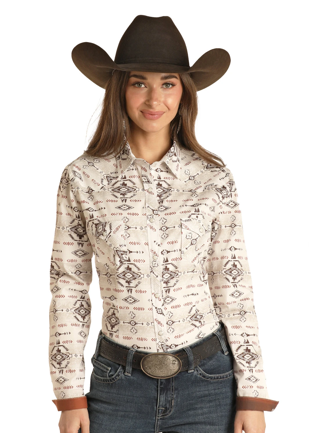 Beige with Brown and Red Aztec Print Long Sleeve Snap Front Shirt.