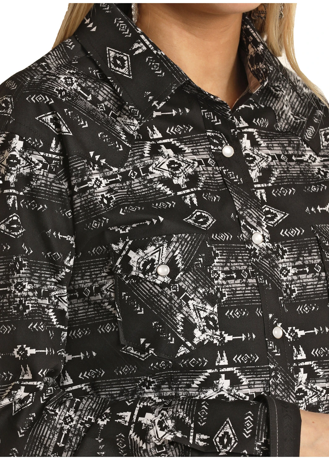Black and White Aztec Stripe Long Sleeve Snap Front Shirt.