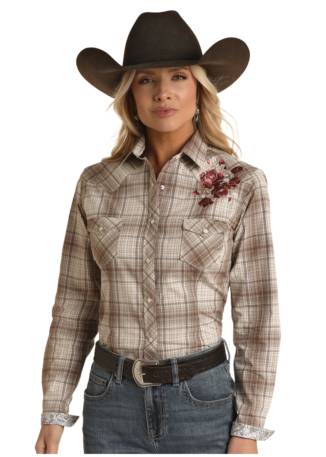 Brown and White Plaid Long Sleeve Snap Front Shirt with Floral Embroidery.