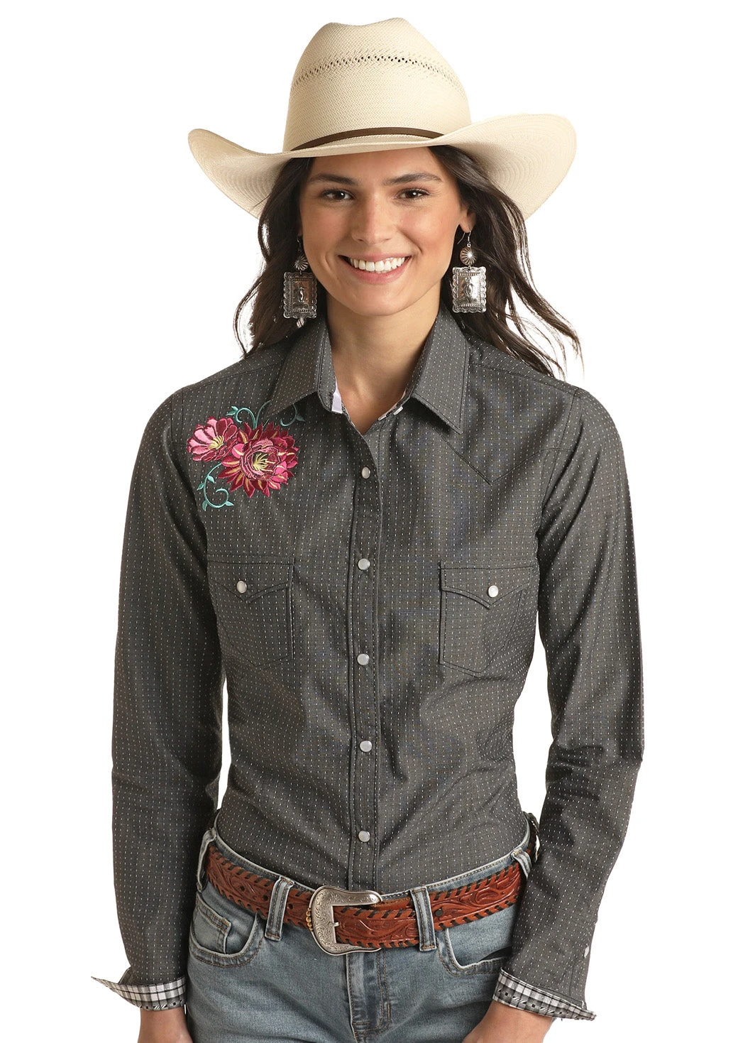 Black Long Sleeve Snap Front Shirt with Floral Embroidery.