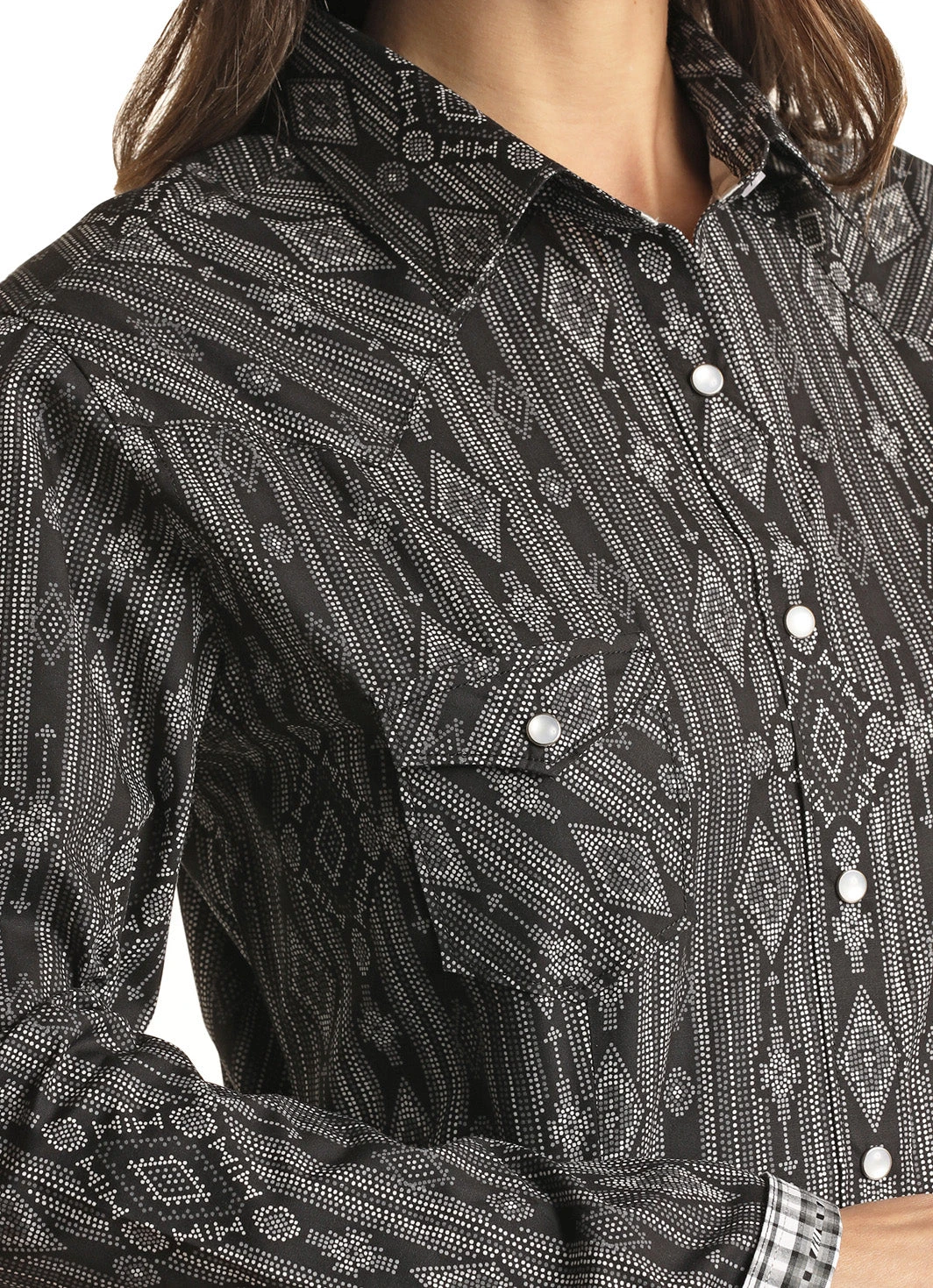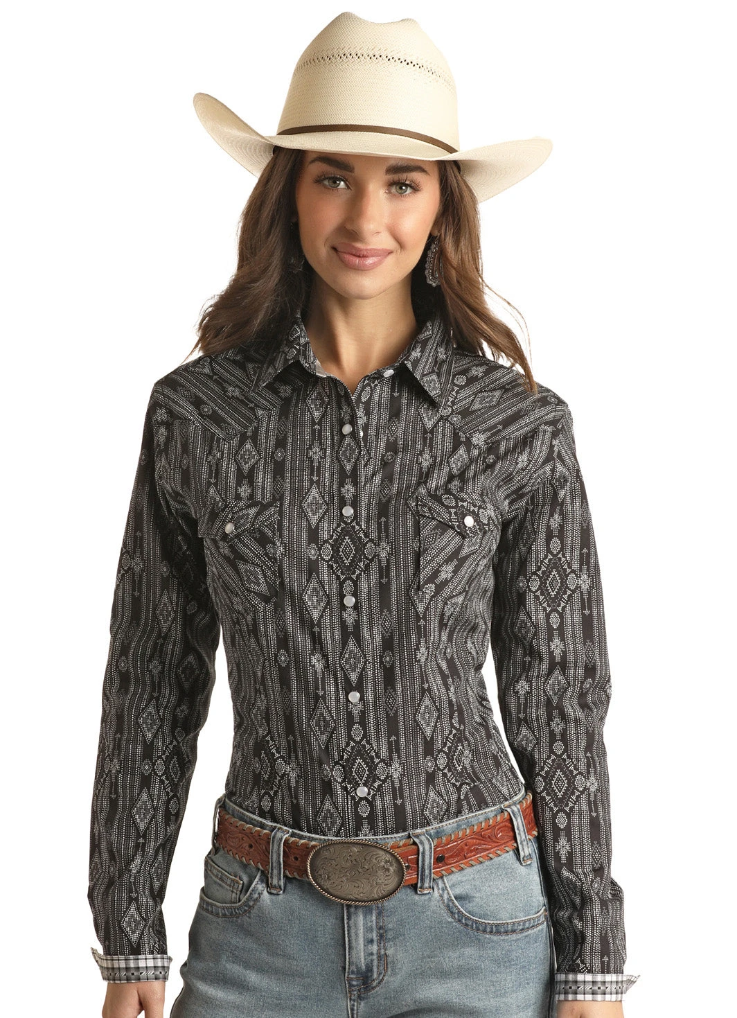 Black with White Dot Southwestern Print Long Sleeve Snap Front Shirt.