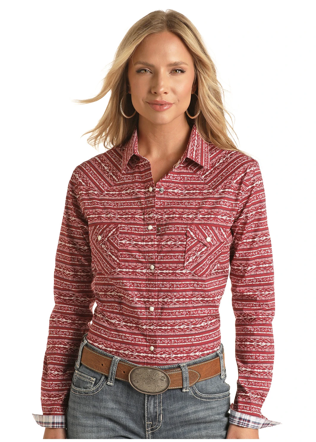 Red and White Abstract Stripe Long Sleeve Snap Front Shirt.