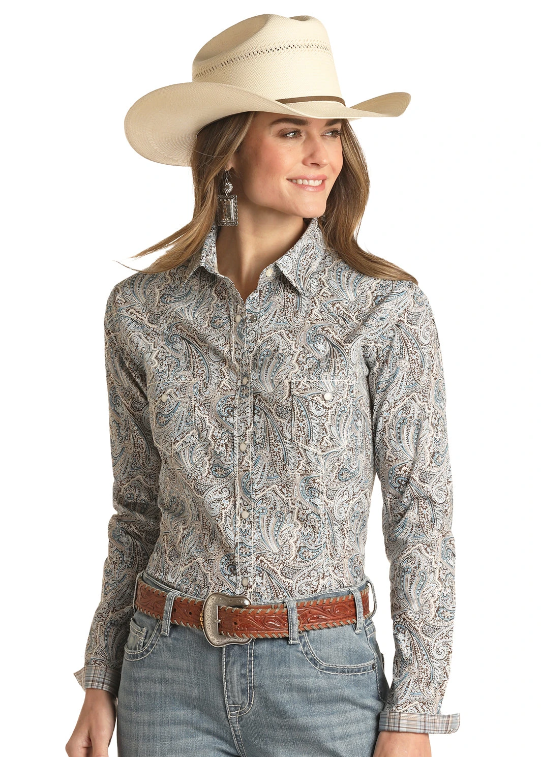 Mahogany Paisley Print Long Sleeve Snap Front Skirt.
