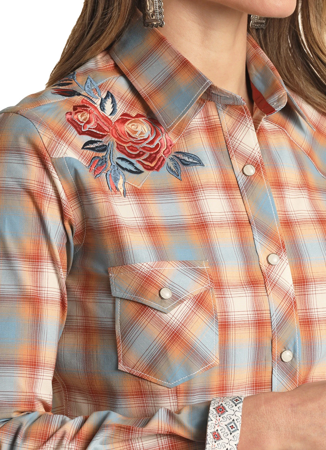 Peach, Red and Blue Plaid Long Sleeve Snap Front Shirt with Flower Embroidery Detail.
