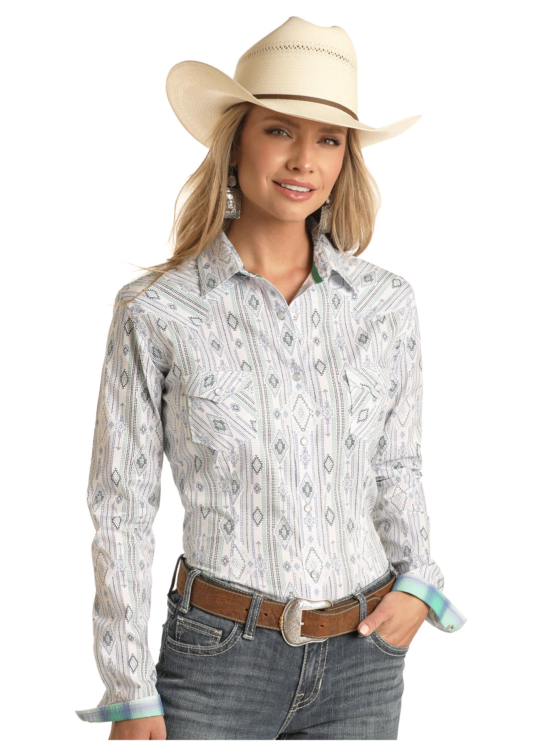 White with Multi Color Dot Southwestern Pattern Long Sleeve Snap Front Shirt.